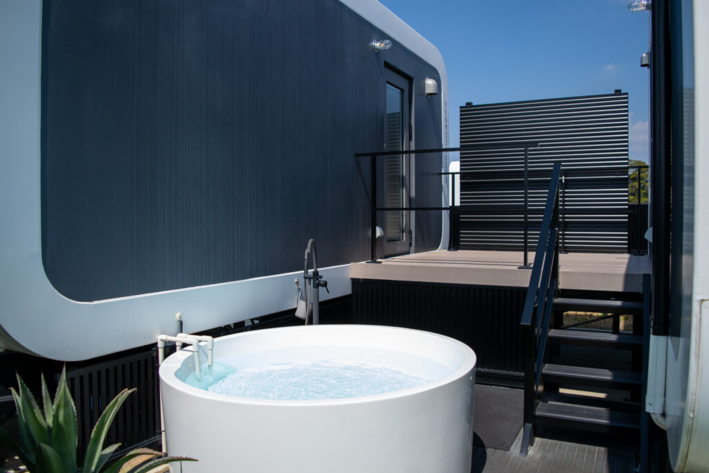 2棟のトレーラーハウスがならび、その間に水風呂。