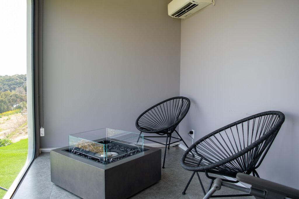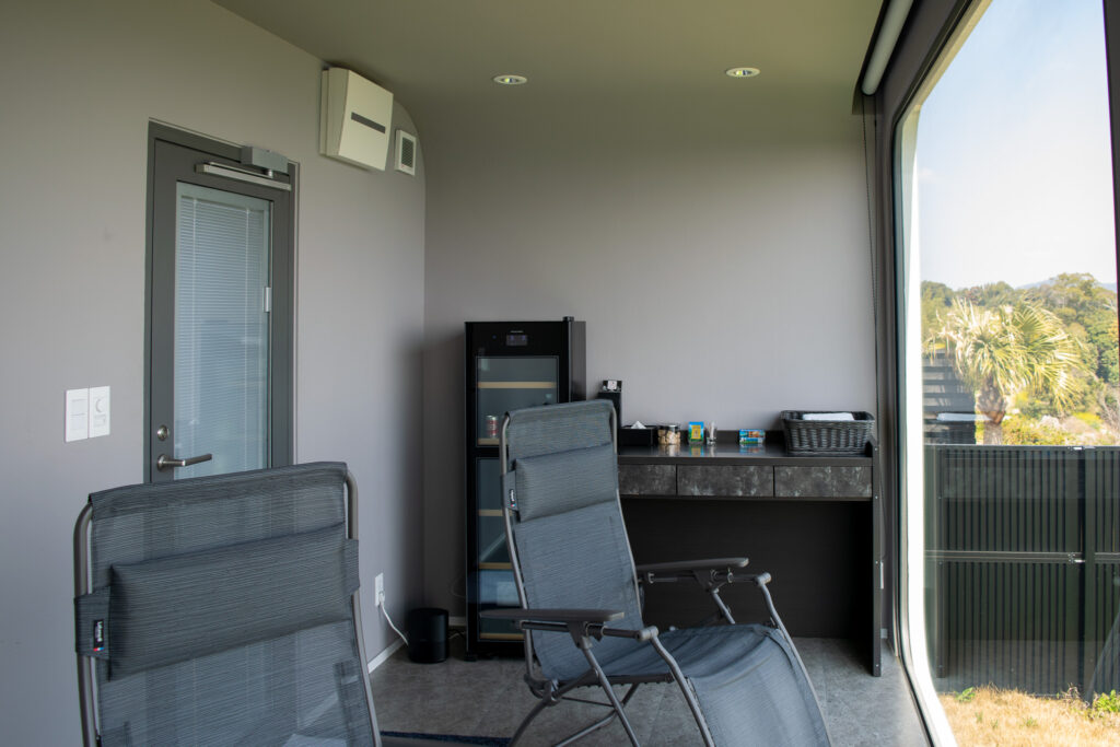もう一方は一面ガラス張りの休憩スペースで、インフィニティチェアとアカプルコチェアが待っている。