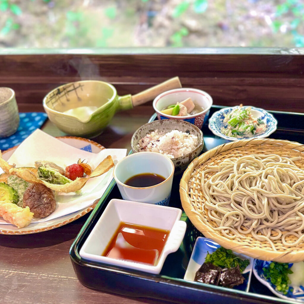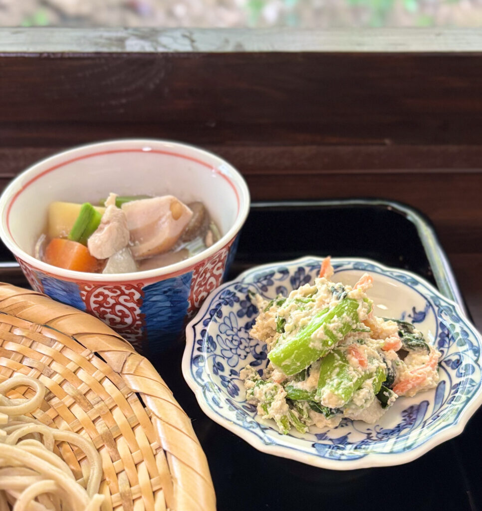 ざる蕎麦に天ぷら、2種の小鉢、ご飯、漬物のセット。